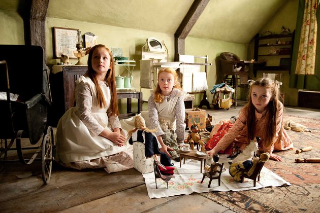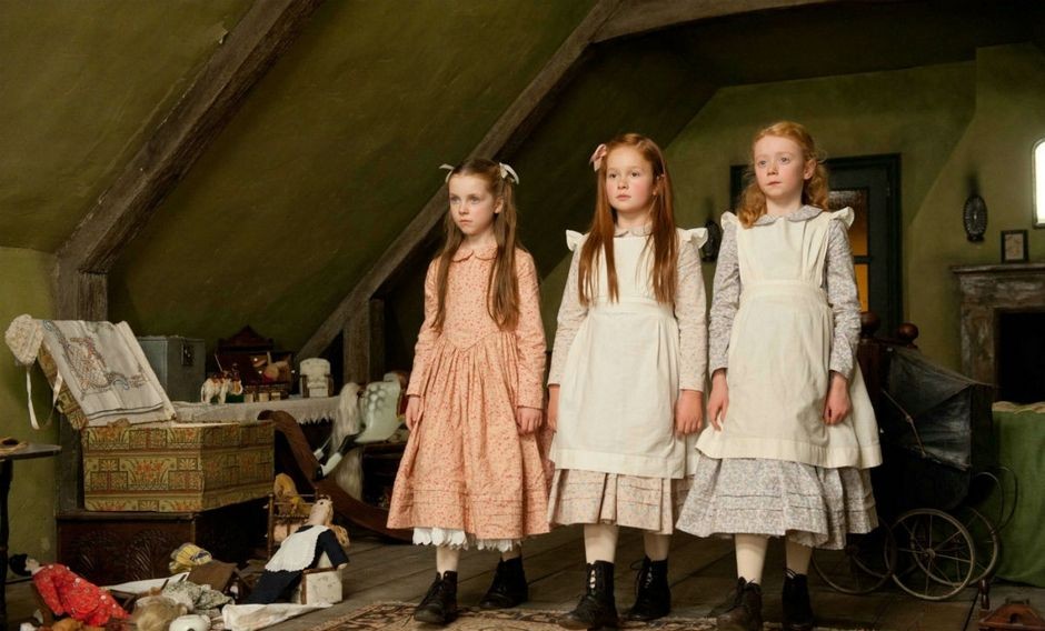 The scene begins with a fade in from complete darkness, then a close-up of the teacups/teapot . They are most likely to be porcelain or China , since in the Victorian era, children often imitated their parents by playing pretend, whether it be tea parties, or wars. The girls' room is typical of the victorian era, the movie is set in; the inclusion of a tea party set, placed in the middle of the room, china dolls, a pale nightstand, and a rocking horse add to the audience's expectations of a 6 year old's room in the 19th century. However, the pale green walls look yellowed with age, implying that there is a lot of history within the house